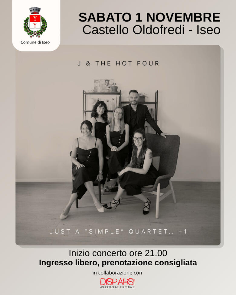 Sabato 1 Novembre - Castello Oldofredi di IseoDopo il grande riscontro ottenuto durante l’ultima serata della rassegna ViM – Voci in Musica, le J & The Hot Four tornano a Iseo per presentare il loro primo album, Just a "Simple" Quartet…+1.Il concerto si terrà nella sala civica del Castello Oldofredi, e rappresenta una nuova occasione per ascoltare dal vivo questo raffinato quintetto composto da Chiara Bertelli (soprano), Elena Troiano (mezzosoprano), Giorgia Gusmini (mezzosoprano), Ilaria Tengatini (contralto) e Giacomo Ferrari (contrabbasso).Il gruppo propone una personale interpretazione di grandi standard del jazz insieme a brani originali, frutto di due anni di ricerca e di una profonda intesa musicale.